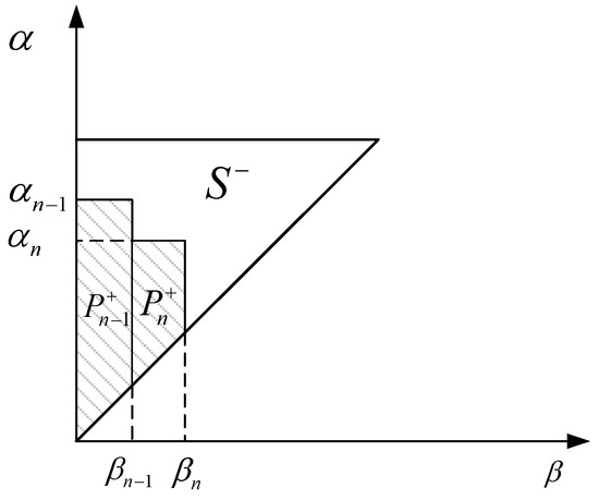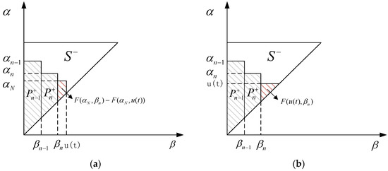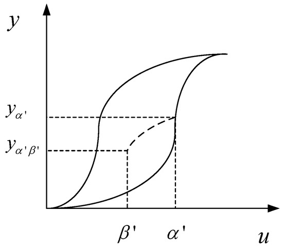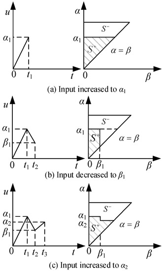Figure 11 shows the memory staircase curve that separates the Preisach plane, which contains the last two sets of maximal/minimal input values, and separates the grey region of the Preisach plane into two regions, namely and . Therefore, combined with Equation (6), Equation (4) can also be written as follows: