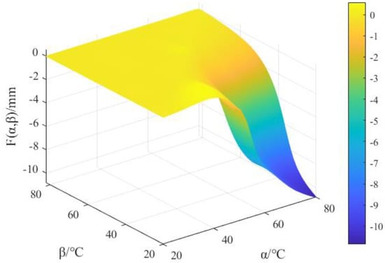 The experimental steps are as follows: at a temperature below Mf, SMAs were heated to a specified temperature, and then cooled down. In the cooling process, the temperature and deflection changes were recorded based on thermocouple and laser displacement. Secondly, we programmed MATLAB to fill the first-order descending curves using the “interpolation” command. Figure 13 shows the distribution of the Preisach plane.