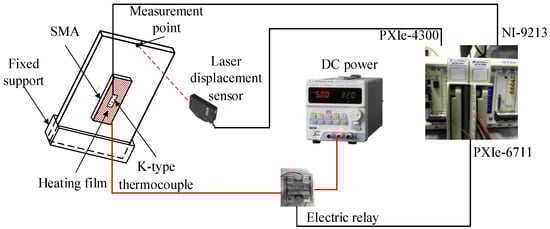 After designing a PID control system, an efficient and reasonable hardware architecture based on the SMA-based actuator deformation test bench is established as follows. A NI PXIe-8840QC real-time controller is inserted into the NI PXIe-1082 case, both of which are provided by National Instrument Company. A NI USB-9213 thermocouple input card is selected to record the data signals of the K-type thermocouple. A NI PXIe-4300 data acquisition card is selected to record the data signals of the laser displacement sensor. In addition, a NI PXIe-6711 analog output card is selected for analog signal output. The SMA-based actuator deformation control test bench is shown in Figure 15.