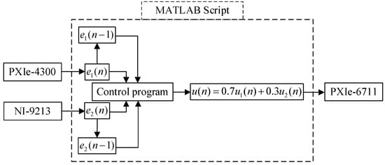 The control program is integrated in LabVIEW via MATLAB, where e1 is the displacement error, and e2 is the temperature error. The weight ratio of these two errors in the control program is 70% and 30%, respectively. The temperature error is the auxiliary control quantity of the system, which is provided by the Preisach plane. According to Equation (14), the control program in Figure 16 can be written as follows: