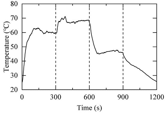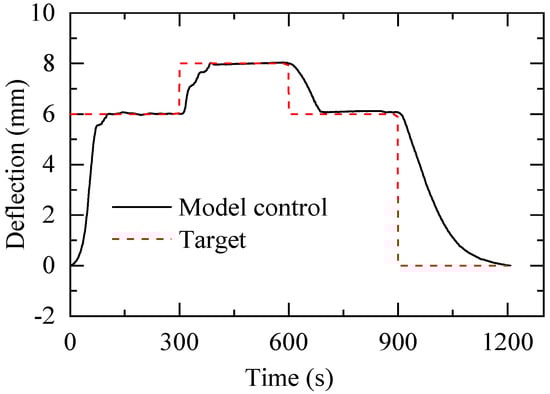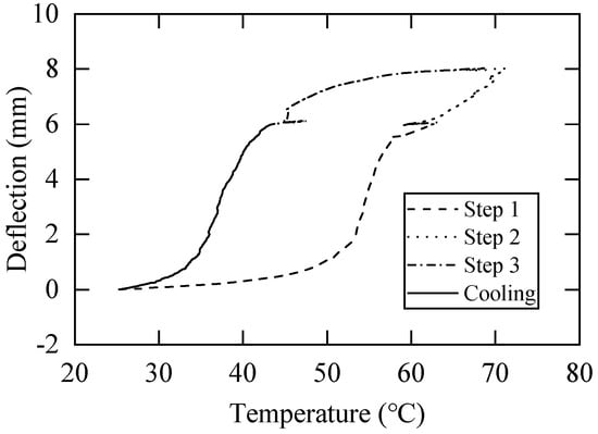 The temperature change in the model control process is shown in Figure 18. The temperature of the SMA-based actuator starts at 25 °C, and the deflection at its upper edge starts at 0 mm. After about 100 s, the first control target is completed, the deflection is stabilized at 6 mm, and the temperature is also stabilized at 60 °C. In the next step, the temperature continues rising. After about 100 s, the deflection is stabilized at 8 mm, and the temperature is stabilized at 69 °C. In order to achieve the last target deflection, the heating process is temporarily stopped until the temperature approaches 45.5 °C in Step 3, and the deflection is stabilized at 6 mm. The temperature–deflection data of model control results are shown in Figure 19. There are no obvious hysteresis loops in the whole control process.