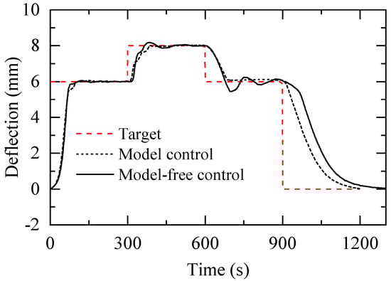 For model-free control, deflection is used as the feedback quantity of the control system, and temperature feedback related to the Preisach model of the SMA-based actuator is removed. With the other conditions being unchanged, the effect of the modeled control and the model-free control is compared in Figure 20. In Step 1, both the model control and model-free control present a better control effect. Compared to the model control, the model-free control shows a slightly longer steady-state time. In Step 2, compared to the modeled control, in addition to the long steady-state time, the model-free control shows a large amount of overshoot. In Step 3, the model-free control cannot reach the control target within 300 s. On the contrary, the model control presents a good control effect. As a result, the time-domain performance index of the modeled control and model-free control includes steady-state time, steady-state error, and relative error, which are summarized in Table 4.