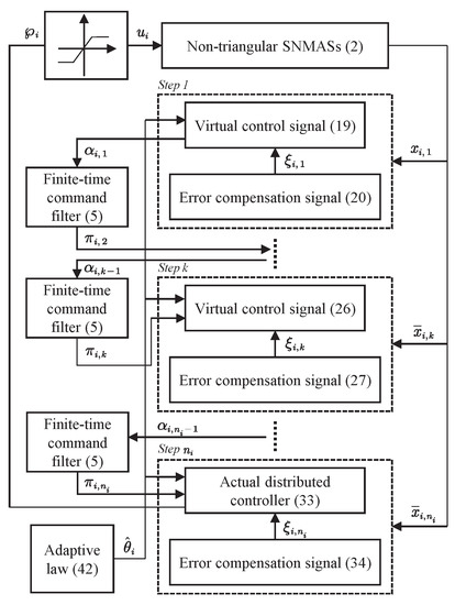 In this section, the finite-time distributed consensus control algorithm is proposed via the command filter technique and backstepping design method. In each step, a distributed virtual control signal will be structured, and the actual distributed controller will, finally, be designed.