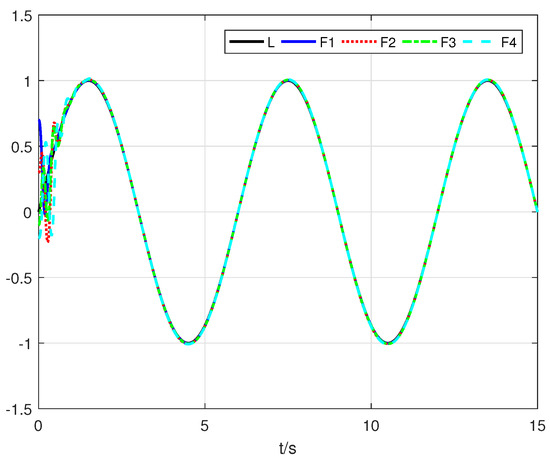 Although the finite-time command filter in [25,26,27] was used to approximate the derivative of a distributed virtual control signal, the Lipschitz condition of a distributed virtual control signal is required and the chattering phenomenon may arise. The demand of the distributed virtual control signal in [25,26,27] can be weakened via the adopted finite-time command filter (5), where the distributed virtual control signal is merely continuous and piecewise two-order derivable; meanwhile, the chattering phenomenon is skillfully attenuated.