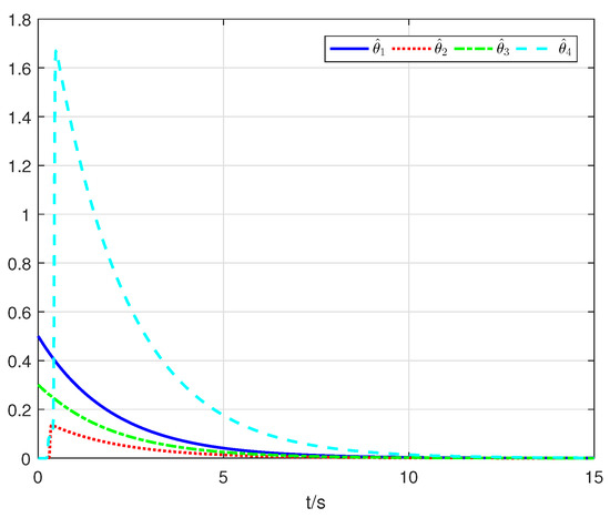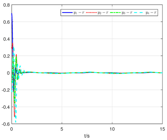 The simulation results with the proposed finite-time distributed consensus control algorithm are displayed in Figure 3, Figure 4, Figure 5 and Figure 6. Figure 3 shows the trajectories of the follower output signals and leader signal r. The trajectories of the consensus tracking errors are given in Figure 4. The trajectories of the adaptive laws are demonstrated in Figure 5. Figure 6 depicts the trajectories of the control inputs . It can be seen from the simulation results that the proposed finite-time distributed control strategy achieves good consensus tracking performance even though unknown nonlinear dynamics and input constraints are included.