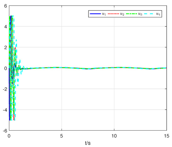 - In comparison with command-filter-based finite-time distributed control algorithms for SNMASs [26,27], an improved finite-time distributed consensus control scheme is proposed for SNMASs with input constraints, which effectively attenuates the chattering phenomenon, and the consensus tracking errors converge to a sufficiently small neighborhood of the origin in a finite time.