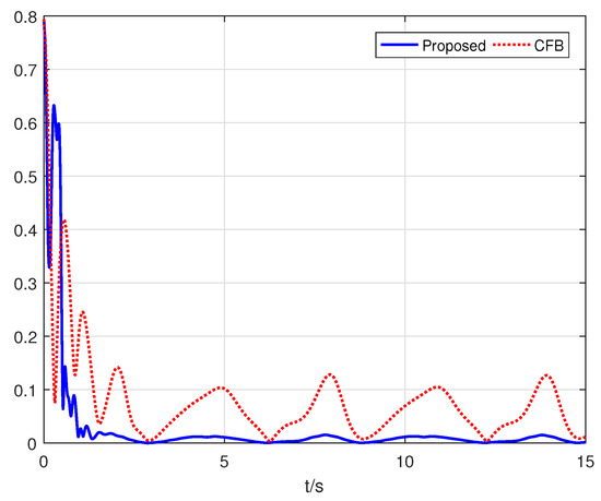 The trajectories of the OTE for the proposed control scheme and the CFB control algorithm in [23] are presented in Figure 7. The settling time and the RMSE in the performance comparison between the two control schemes are shown in Table 1, where we suppose that the settling time was the time after which always held. It can be seen from Figure 7 and Table 1 that, benefiting from the finite-time convergence compensation error mechanism, the settling time and RMSE of the proposed control scheme were lower than those of the CFB control algorithm in [23]. Obviously, the proposed finite-time distributed consensus control algorithm not only had a faster convergence rate, but also obtained better tracking performance compared with that of the CFB in [23].