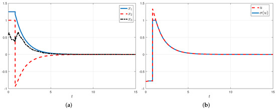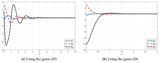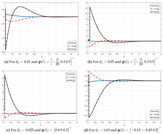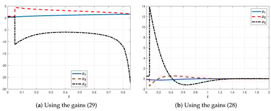 - Delay does not affect system. Here, we set , and both controllers are applied to the system under . The evolution of the state signals is plotted in Figure 3.