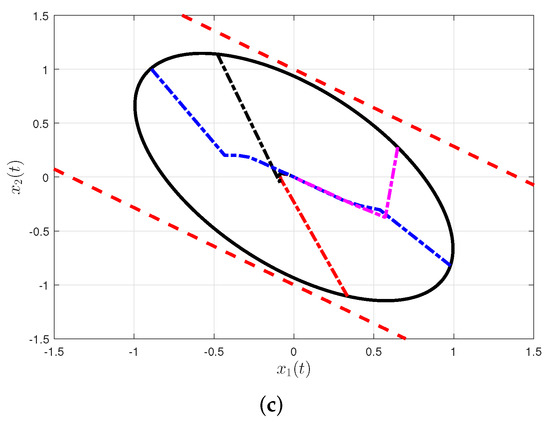 The simulation results are presented in Figure 2 using the above-mentioned fuzzy control gains. In particular, Figure 2a depicts the state responses of the saturated closed-loop for the initial condition . Based on Figure 2c, it is evident that the closed system is well-controlled. Figure 2b illustrates the estimated domain of attraction for various initial conditions when actuator saturation is present and time-varying delay exists.