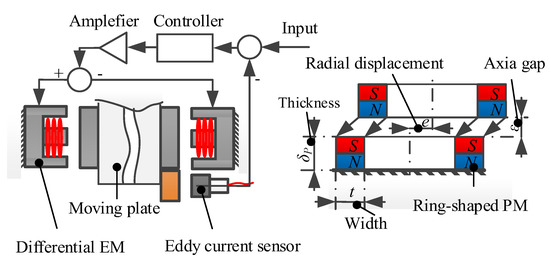 The actuator can translate in the X and Y directions and rotate around the Z axis. The actuator principle relies on a differential electromagnet to provide the driving force, which makes the moving plate move, as shown in Figure 2. The recovery force and initial stiffness are provided by two axially magnetized permanent magnets. The position real-time feedback signal is provided by an eddy current displacement sensor. The motion in the X direction is driven by two pairs of differential electromagnets consisting of electromagnets 1 and 2 and electromagnets 3 and 4. The motion in the Y direction is driven by a pair of differential electromagnets consisting of electromagnets 5 and 6. The rotation motion around the Z axis is acted by three pairs of differential electromagnets.