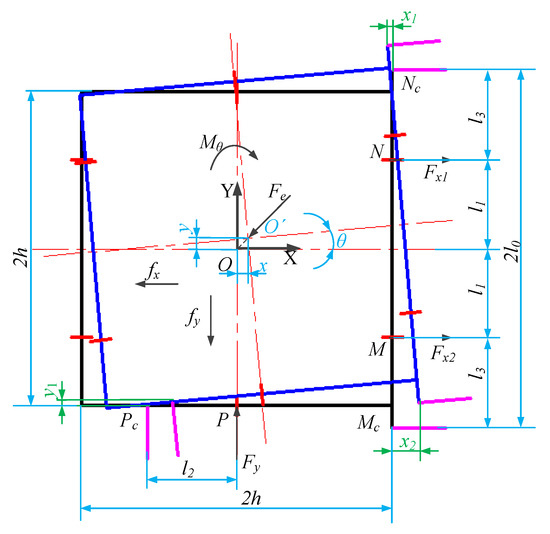The force analysis of the actuator is shown in Figure 3. According to the structure of the actuator, when taking the equilibrium position, the center of mass O of the moving plate is the origin of the coordinates, and its coordinates are represented by (x, y, θ). The X and Y are pointing, and counterclockwise rotation around the Z axis is shown in Figure 3 as the positive direction. When an input signal is given to the actuator, the actuator moves the moving plate, and the signals detected by the sensor are x1, x2, and y1; the driving forces provided by the three pairs of differential electromagnets are Fx1, Fx2, and Fy1; the ring-shaped permanent magnet The provided restoring force is Fe (which can be decomposed into Fex and Fey); frictional resistance fx, fy; frictional resistance torque Mθ. Under the action of these resultant forces (or resultant torque), the moving plate moves to a new equilibrium position O’ (x1, x2, y1). Nc is the detection point of sensor 1; Mc is the detection point of sensor 2; Pc is the detection point of sensor 3; N is the action point of the differential electromagnet force composed of electromagnet 3 and electromagnet 4; M is the action point of the differential electromagnet force composed of electromagnet 1 and electromagnet 2; P is the action point of the differential electromagnet force composed of electromagnet 5 and electromagnet 6.