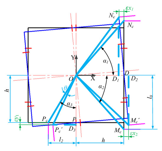 According to the force analysis, the movement of the center of mass of the moving plate of the actuator is X, Y, and θ, and the signals detected by the sensor are x1, x2, and y1. To facilitate modeling, the coordinate system is transformed. It can be known from the geometric relationship: