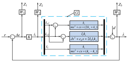 According to Formulas (6), (9) and (10), it can be seen that the measurement value of the sensor ignores the influence of the rotation angle and the driving force, and the restoring force ignores the high-order term of the Taylor expansion. The actuator has external environmental interference and some inevitable modeling errors. A mixed sensitivity robust control strategy is adopted to ensure the system can work stably under the above uncertain conditions. The system control block diagram is shown in Figure 5.