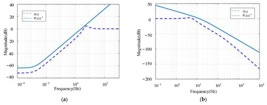 The amplitude–frequency characteristic curves of S(s) and W1−1(s) in the θ direction are shown in Figure 8a. The amplitude of (S(s)) is extremely small in the low-frequency range, and its maximum amplitude is less than (W1−1(s)) in the whole frequency range, which satisfies Formula (20). Therefore, the anti-interference ability and tracking characteristics of the system are ensured. The amplitude–frequency characteristic curves of T(s) and W3−1(s) are shown in Figure 8b. (T(s)) has a large slope in the high-frequency range, and its maximum amplitude is smaller than (W3−1(s)) in the whole frequency range, which satisfies Formula (21). It ensures that high-frequency noise is rapidly attenuated.