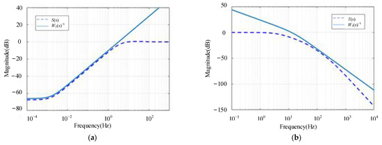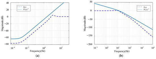 Amplitude–frequency curve. (a) Amplitude–frequency curve of S(s) and W1−1(s); (b) Amplitude–frequency curve of T(s) and W3−1(s).