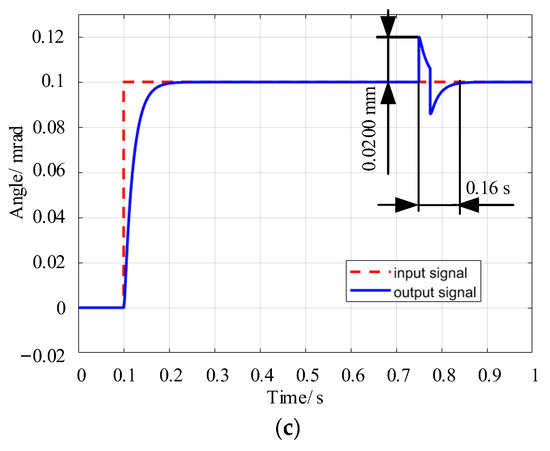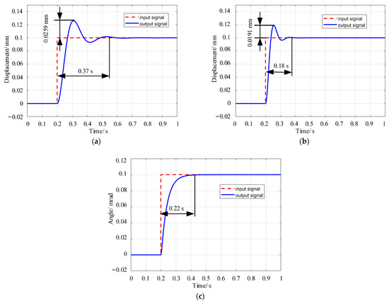 The Y direction simulation: At 0.2 s, a signal of 0.1 mm is input in the Y direction. The system response results are shown in Figure 9a. The X direction simulation: At 0.2 s, a signal of 0.1 mm is input in the X direction. The system response results are shown in Figure 9b. The θ direction simulation: At 0.2 s, a signal of 0.1 mrad is input in the θ direction. The system response results are shown in Figure 9c.