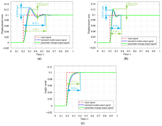 Step response. (a) Step response of Y direction with 20% parameters change; (b) Step response of X direction with 20% parameters change; (c) Step response of θ direction with 20% parameters change.