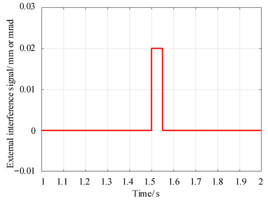 An external pulse disturbance was input to verify the system’s response in the case of external disturbances, and the results are shown in Figure 11. The vertical coordinates of Figure 11 have two units, “mm” and “mrad”, respectively. The unit of vertical coordinate is “mm”, which indicates the disturbance signal in Y and X directions. The unit of vertical coordinate is “mrad”, which means the interference signal in θ direction.