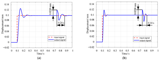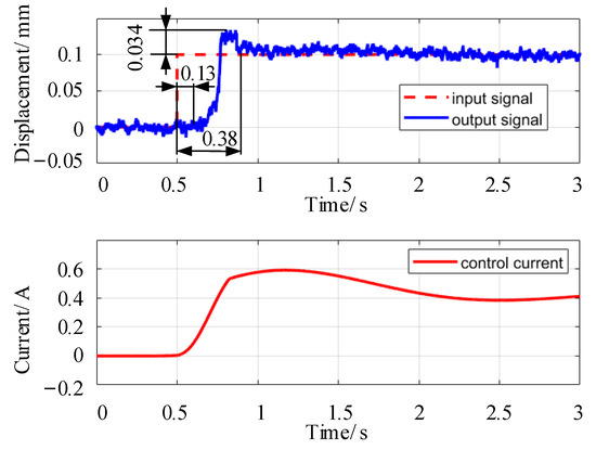 When the system was stable, a step signal in the Y direction of 0.1 mm was input in 0.5 s, and the result is shown in Figure 14. The control current first increased and then leveled off. The system stabilized after 0.38 s with an overshoot of 0.034 mm. According to Figure 14, there was a time lag of 0.13 s, which was mainly caused by the following three reasons. First, in the actuator structure, there was only one pair of differential electromagnets in the Y direction and two pairs of differential electromagnets in the X direction, so the stiffness in the Y direction was smaller than that in the x direction. In the initial stage of current change, the driving force could not overcome the initial electromagnetic force. Second, the ring permanent magnet in the actuator was opposite the pole, so the attraction was larger, resulting in greater friction resistance. Third, to make the actuator in a wider range of stable control, the designed controller had robust conservatism. For these three reasons, the time lag was 0.13 s.