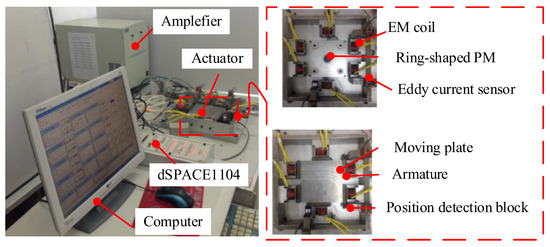 Experiments were carried out to verify the controller’s effectiveness in the laser focus position control. The experimental equipment mainly comprises a power amplifier (E120/06), eddy current sensor (EX-V10), dSPACE1104, actuator, etc., as shown in Figure 13. With dSPACE1104 as the core hardware, the mixed-sensitivity robust control of the actuator was performed to control its real-time position. We used dSPACE1104 to connect with MATLAB/Simulink for experiments seamlessly. First, the sensor detected the position signal and input it to the ADC module in dSPACE1104. After the control block diagram operation in Simulink, the input signal of the system was obtained. Second, the position signal detected by the sensor and the input signal of the system was subtracted to obtain the deviation signal. Then, the deviation signal was input into the controller in Simulink to obtain the control signal. Third, the control signal was input to the DAC module in dSPACE1104, and the input signal of the power amplifier was obtained. Finally, the power amplifier input the signal to three sets of differential electromagnets to realize real-time control of the actuator position.