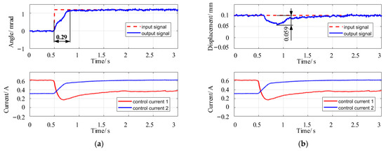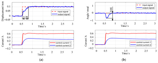 When the system is stable, a step signal in the direction of θ of 1.2 mrad is input in 0.5 s, and the result is shown in Figure 16. According to Figure 16a, control current 1 decreases first and then tends to be stable, while control current 2 increases first and then tends to be stable, and the output signal in the θ direction reaches the steady value in 0.29 s. According to Figure 16b, after we input θ signal, a fluctuation of 0.059 mm appears in the X direction. This is because the motion of the actuator in both X and θ directions is driven by X direction 2 to the differential electromagnet, and there is coupling.