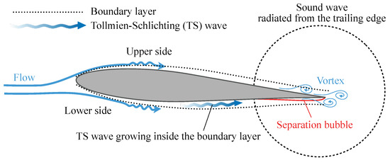 Many pieces of previous research have investigated the physical mechanism of the LBL-VS type of TE noise since the early 1970s [2,3,4,5,6,7,8,9,10,11,12,13]. Figure 1 schematically depicts the source of the TE noise. The self-sustained discrete tone is maintained by an acoustic feedback loop consisting of the velocity instabilities of the laminar boundary layer, known as the Tollmien-Schlichting (TS) wave, and the sound wave from the trailing edge [6,7,8]. The sound wave (and disturbances in the surrounding flow) initially excites the velocity fluctuations in the boundary layer on the airfoil fore part [13], and the induced fluctuations grow as the TS wave flows ahead to the trailing edge. The dominant frequency of the TE noise agrees with the TS wave frequency estimated from the linear instability theory [3,7,12]. Previous studies [3,12] have indicated that the lower side laminar separation bubble also plays an essential role in the velocity amplification and in selecting the dominant frequency. The vortices generated by the TS wave interact with the trailing edge. Consequently, the vortex sound is radiated as the TE noise. The sound wave propagates to the upstream direction and excites the boundary layer again. This acoustic feedback loop maintains the generation of noise and also contributes to secondary tones around the main tone frequency [3,8,14].