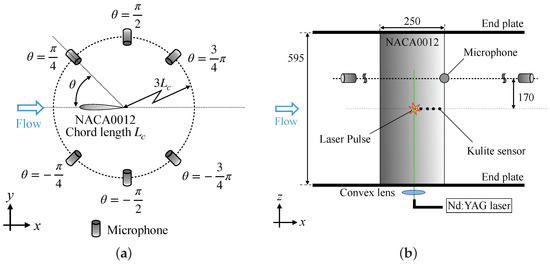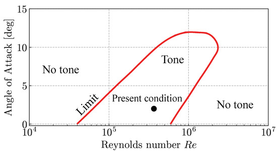 In the wind tunnel experiments, the free stream was set at the velocity of m/s and the temperature of K, where the subscript ∞ denotes the uniform flow variables. The chord length-based Reynolds number was with the density and the visosity at the uniform flow. The angle of attack was fixed at . This flow condition is chosen using Lowson’s diagram [4] (Figure 3), which displays the Reynolds number and angle of attack region in which the tone noise phenomenon is expected. We assume that the external temperature has a small impact on the laser-driven control system since the temperature induced by the laser irradiation is much higher than the surrounding air [24]. Hence, we conducted the wind tunnel test at the standard room temperature. In this flow condition, the vortices on the lower airfoil surface were the main source of the TE noise [10].
