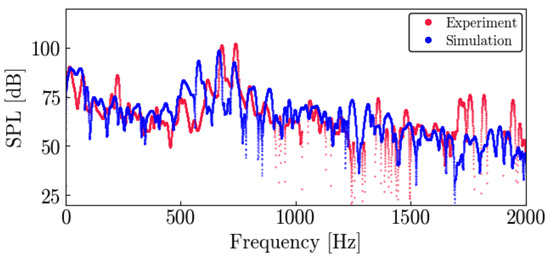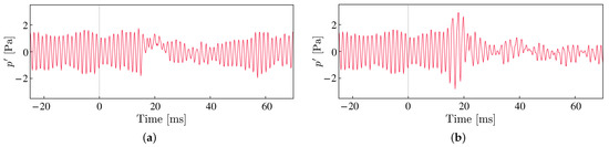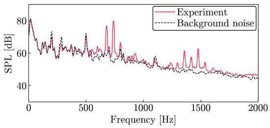 is calculated using the measured pressure. Here, is frequency resolution and is the reference pressure level Pa. PSD indicates the power spectral density function of the pressure fluctuations. The time series data were collected for 30.0 s with a recording rate of 50 kHz and were converted into the PSD by Welch’s method [25] together with a Hanning window. In the calculation, the time series was segmented into 200 sections, and Welch’s method was performed with a 50% overlap.