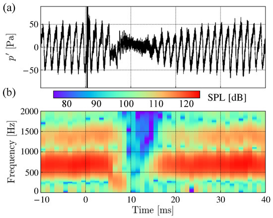 The frequency–time diagram in Figure 6b shows that the fluctuation is suppressed not only for the dominant frequency of 680 Hz but also for the overall frequencies between 6.0 ms and 16.0 ms. We experimentally confirmed that the pulsed laser could reduce the pressure fluctuation due to the TE noise within a certain time range by an energy deposition just outside of the boundary layer.