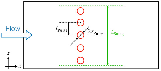 In this study, we considered two pulse conditions with different , as summarized in Table 1. The “Narrow” case has the same length of the pulses chain as the wind tunnel test, whereas the “Wide” case has a longer length. Calculations were performed in two sets of , , and listed in Table 1. In both cases, the pressure impulse and the energy application time were equal. The center of the chain of plasma beads was set as as shown Figure 9. The two parameters and in Equation (7) were determined as and μs. These parameters were determined to fit the pressure fluctuation in the experiment shown in Figure 6.