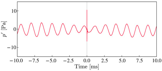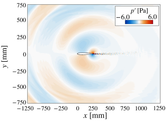 First, we validated the numerical simulation by examining the pressure fields without the energy deposition. Figure 10 shows an instantaneous pressure fluctuation at . The dipolar distribution about the surface indicates that the present computation properly simulates the target acoustic phenomenon emitted from the trailing edge. We also compare the pressure fluctuation on the airfoil’s surface with the wind tunnel data in Section 2. The SPL probed at mm (80% chord position) on the pressure surface in Figure 11 indicates good agreements between the present computation and the experimental data. The figure shows the typical characteristic frequencies associated with the trailing-edge noise. The dominant peak frequency in the numerical simulations is Hz, close to the experimental value of 677 Hz. The multiple peaks around the dominant frequency are also observed in the wind tunnel test and are reported in several previous studies [3,12]. Some peaks between 1700 Hz and 2000 Hz of the experiment in Figure 11 are caused by measurement noise because they have the same SPL level even if observed at another transducer. These results confirm that the present calculations capture the essential features of the flow field with the TE noise in the experiment.