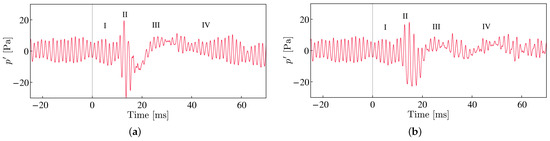 Here we divide this process into four phases, as shown in Figure 13. The duration when the pressure fluctuations correspond to the basic state of the TE noise is called phase(I). The period of time during which the amplitude temporarily increases due to the application of the laser energy is called phase (II). The subsequent period of decreasing the amplitude is called phase (III). The final recovery to the basic state is called (IV). It should be emphasized that these phases are equivalent to those observed in the experiment shown in Figure 6.
