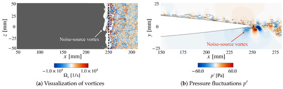 The visualizations at ms and ms in Figure 15 and Figure 16 show the vortex dynamics related to phases (III) and (IV) in Figure 13. In the Narrow case, as shown in Figure 15, the visualization of the vortices at ms shows that the ASV sweeps out the source vortices of TE noise observed in Figure 14. The source vortices are then reconstructed at ms, corresponding to the amplitude recovering at phase (IV) in Figure 13. These results indicate that the disappearance of the source vortices by the ASV leads to a reduction in the noise.