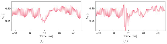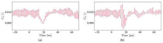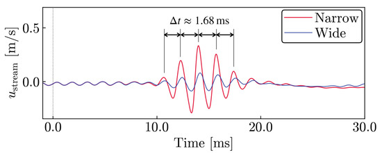 Next, we examine the pressure fluctuations on the airfoil wall. As we explained in Section 2, the surface pressure fluctuations on the lower airfoil surface are correlated with the intensity of the velocity fluctuations by the TS wave and the vortices. Figure 13 shows the time history of the surface pressure fluctuations measured at (corresponding to 90% chord position) on the lower side surface around the energy deposition time. We note that the amplitudes of these fluctuations are smaller than the experimental result in Figure 6. The discrepancies might come from the difference in the separation bubble sizes, which affects the amplitude of the pressure fluctuations near the trailing edge [3,7]. However, considering that the current computation simulates the qualitative behavior of the pressure response after laser irradiation (see Figure 6a and Figure 13a), the presented result provides the key physics of the targeted wind tunnel test. These fluctuations in the surface pressure are closely related to the amplitudes of the TE noise detected by microphones shown in Figure 12. For example, in the Narrow case, the pressure fluctuation retains its amplitude until . Following the large amplitude of pressure fluctuations from ms to 20 ms, a decrease in the amplitude is observed from ms to 40 ms. Finally, the pressure fluctuations recover to the same state as before the pulsed laser irradiation.