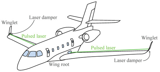 Finally, we present our future plan regarding how the laser actuator in this study would be installed in an actual aircraft, as schematically explained in Figure 20. The figure illustrates that the laser irradiation from the wing root focuses on the airfoil’s surface to control the flow field. In the illustration, we take advantage of the wing tip as a laser damper to cut off the laser. We believe the presented actuator could provide one possible option to control aircraft noise.