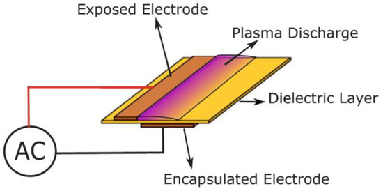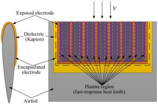 Dielectric barrier discharge plasma actuators are very simple electronic devices that have attracted great interest from the scientific community in recent years [90,91,92]. These devices are capable of imparting a momentum to the adjacent flow that can be used to manipulate the surrounding flow field. For this reason, they have been studied primarily for active flow control. The conventional configuration shown in Figure 6 is based on two electrodes placed asymmetrically and separated by a dielectric layer. One of the electrodes is located on top of the dielectric layer, while the other is located at the bottom. As a result, the first electrode is fully exposed to the adjacent atmosphere and is referred to as the exposed electrode, while the second electrode is embedded in the dielectric layer and is commonly referred to as the embedded, covered, or encapsulated electrode. The embedded electrode is electrically isolated from the exposed electrode and the surrounding atmosphere and is connected to ground. The exposed electrode, on the other hand, is excited with a sinusoidal voltage signal with a frequency on the order of kilohertz [93,94,95]. The dielectric layer can be made of any dielectric material with good insulating properties and high dielectric strength [96,97].