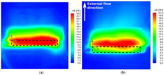 A typical surface temperature contour of a DBD plasma actuator is shown in Figure 8. This figure shows the surface temperature field of a plasma actuator operated at quiescent conditions and under the influence of an external flow. As can be seen in this figure, the temperature of the top surface of the plasma actuator increases significantly due to the plasma discharge. The highest temperatures are measured at the onset of plasma formation near the exposed electrode. At quiescent conditions, the area of the exposed electrode has a similarly high temperature as the area where the plasma starts, due to the good thermal conductivity of the material of the exposed electrode. Under the influence of an external flow, however, the temperature values decrease along the entire actuator surface, with the area of the exposed electrode showing a significantly greater decrease.