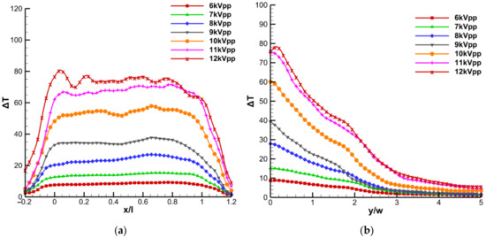 In addition, Figure 9 shows the spatial temperature variation along the top surface of the plasma actuator for different input voltage levels. As we can see, the temperature along the x-axis is higher and almost constant between x/l = 0 and x/l = 1, which corresponds to the region of plasma formation. The temperature increases with increasing applied voltage, and at higher voltages, the temperature profile starts to oscillate more, which means that the plasma discharge becomes more and more filamentary. In the y-direction, the highest temperatures are found near the exposed electrode edge and decrease in the y-direction.