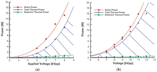 Comparison between active power, total thermal power generated, and power dissipated as dielectric heating in plasma actuators operating at different voltage levels and 24 kHz: (a) actuator made of Kapton with 0.3 mm thickness and (b) actuator made of Kapton with 1.02 mm thickness (reproduced from Rodrigues et al. [98]).