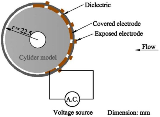 The study by Cai et al. [29] is one of the first experimental reports on the use of DBD plasma actuators for deicing and anti-icing. The authors installed handmade plasma actuators on a cylinder model surface subjected to supercooled flow in a wind tunnel. The DBD plasma actuators consisted of a 0.33 mm thick Kapton dielectric layer (six 0.056 mm thick stacked) and two 0.03 mm thick asymmetric copper electrodes with 3.3 and 10 mm wide exposed and encapsulated electrodes, respectively. The actuators were coupled to a Teflon cylinder (45 mm diameter and 220 mm length), without spacing, in a multiple actuator configuration covering ≈80 mm of the cylinder length, as shown in Figure 11.