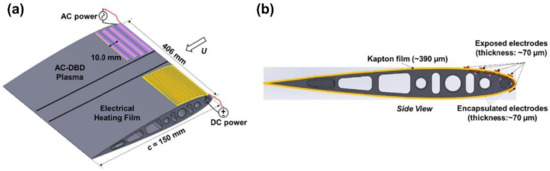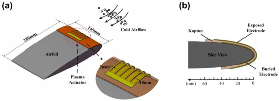 (a) Top view and (b) side view of NACA 0012 airfoil model with the DBD plasma actuator and electrical film heater side-by-side on the surface: (a) top view and (b) cross section view (adapted from Liu et al. [149] with the permission of Elsevier).