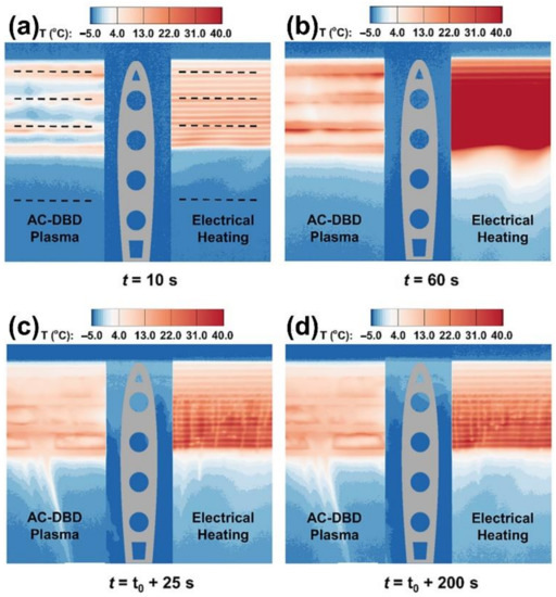 Time evolution of the temperature distributions over the DBD plasma actuator and the electrical film heater airfoil surfaces sides after: (a) t = 10 s, (b) t = 60 s, (c) t = t0 + 25 s, and (d) t = t0 + 200 s (adapted from Liu et al. [149] with the permission of Elsevier).