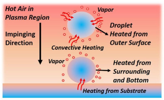 Heating mechanism of an impinging droplet on a DBD plasma actuator surface (adapted from Liu et al. [149] with the permission of Elsevier).