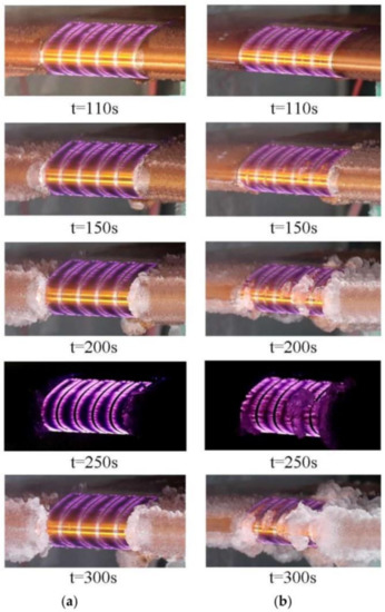 Experiments were performed in an icing research tunnel under conditions of U = 65 m/s, T = −10 °C, LWC = 0.5 g/cm3, and MVD = 25 μm. The wind tunnel was turned on 1 h before the experiments to reach a steady state, then, the NS-DBD plasma actuator was turned on for ≈100 s (t = 0 s) to reach thermal equilibrium, and finally, the water sprayer was activated. To understand the effects of the discharge conditions, experiments with higher voltage amplitude and lower pulse frequency (HV-LF) and discharges with lower voltage amplitude with higher pulse frequency (LV-HF) were performed. Dynamic evaluation of anti-icing, with continuous impact of supercooled water droplets, showed that for the same input voltage, the LV-HF discharge performed better than the HV-LF discharge, as shown in Figure 17.