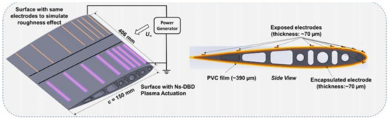 Chen et al. [177] evaluated the anti-icing performance of a nanosecond surface dielectric barrier discharge (NS-DBD) and investigated the effect of pulse frequency and voltage amplitude on actuation performance. The NS-DBD plasma actuator is a device driven by repetitive high voltage pulses with fast rise times on the order of nanoseconds [178]. The NS-DBD consisted of exposed (2 mm wide) and buried (10 mm wide) electrodes with thickness of 0.027 mm separated by three layers of Kapton tape as a dielectric layer (0.24 mm thick) (Figure 16a). The device was installed on an aluminum airfoil model NACA 0012 with a chord length of 280 mm and a spanwise length of 145 mm, as shown in Figure 16b. The airfoil was covered with a film 2.5 mm thick PTFE (polytetrafluoro-ethylene) to prevent heat transfer between NS-DBD and the airfoil structure.