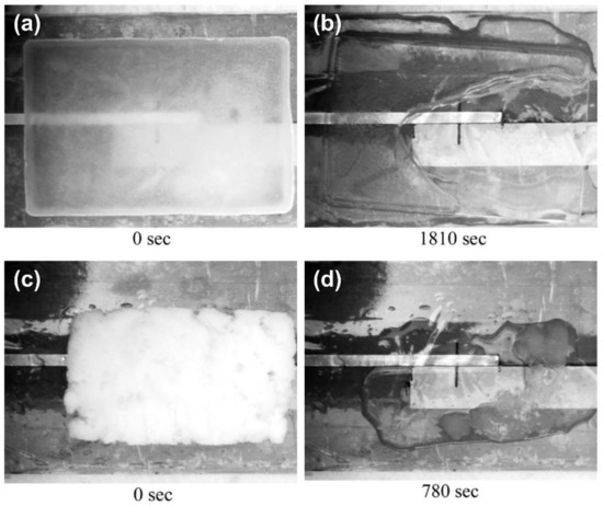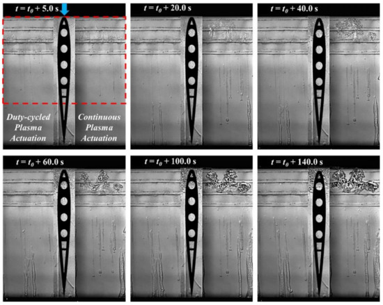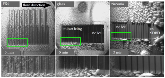 In the context of this study, another report by Liu et al. [176] compared the actuation of DBD plasma actuators with conventional electrical heating using the same experimental setup and conditions as reported in [149]. The reported results are consistent with the previous information. Only after 200 s of operation did ice begin to form at a nearby plasma discharge site. In view of these results, the authors considered that the DBD plasma actuator-based method had a more promising performance compared with the conventional electrical heating method, because the temperature drop on the DBD surface was much lower. This difference was explained by the fact that the water droplets were heated not only by heat conduction but also by heat convection as they moved through the hot air above the DBD (Figure 15).
