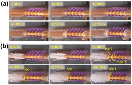Dynamic anti-icing process of NS-DBD plasma actuator: (a) LV-HF discharge and (b) HV-LF discharge (adapted from Chen et al. [177] under the Creative Commons Attribution License).