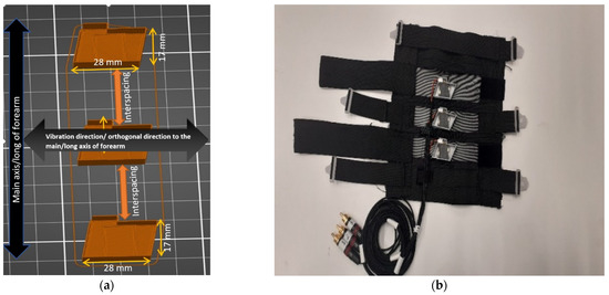 (a) Overview of designing the Lofelt L5 actuators along the forearm; and (b) an example of a wearable vibrotactile sleeve and the configuration of the actuators.