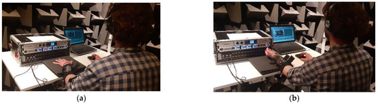 The sites assessed in the localization experiments were the upper and undersides of the forearm. The upper forearm has mostly hairy skin, with a set of mechanoreceptors that differs from those on the glabrous skin of the underside of the forearm [37]. Five different tactile sleeves were tested (five different spacings between the actuators), with three voice coil actuators placed on the longitudinal line on the forearm (causing tangential vibration and lateral skin stretch), while the hand rested on pad support. Before the main experiment, the procedure and tactile stimulation protocol were fully explained to the participants, and their written informed consent was obtained. Before the main experiment began, they completed a few training trials to familiarize themselves with the setup, apparatus, and the vibratory stimulus. The experiments were performed in an anechoic chamber. Two experiments were performed; one where the upper side of the forearm was stimulated (experiment one, see Figure 4A) and one where the underside of the forearm was stimulated (experiment two, see Figure 4B). The experiments were designed to determine the minimum interspacing between actuators that we could use so that the different sites of stimulation could easily be told apart.