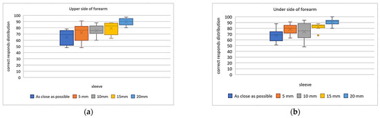 Box–whisker plot comparing the accuracy (percent correct, y-axis) between the five different tactile sleeves with various inter distances between enclosures (x-axis): (a) the percent correct for the upper side of the forearm; and (b) the percent correct for the underside of the forearm. The box length represents the interquartile range (IQR), the 25% and the 75% limits, and the horizontal bar inside the box shows the median value. The ends of the box plot represent minimum and maximum values.